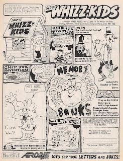 The subject of the previous post in this series was Whizzer and Chips dated 11 November 1989, and if you've read that blog entry you'll be aware that my investigations are now delving into a period in which I have some uncertainties as I try to identify the raiders. This time the issue dated 18 November 1989 is under scrutiny, and I have been able to expose Bernie 'Memory' Banks as the Whizz-kid raider into Chips, as he can be seen in that week's episode of The Ossies. However I have been unable to identify a Chip-ite raider within any strips appearing in the Whizzer portion of the comic, although Chips-dwellers Mustapha Million, Shiner and JR feature in cartoon gags on Sid's Whizz-kids page. I'm not sure whether these actually constitute raids, since our Chip-ite chums are clearly the butts of their respective jokes and are looking distinctly uncomfortable. Maybe these incursions should be categorised as failed raids in which the perpetrators have been detected. Assuming this to be the case I have logged this issue as containing a raid (unsuccessful as it was) perpetrated by Mustapha who is, of course, the only one of the 3 interlopers to have originated in Cheeky Weekly.